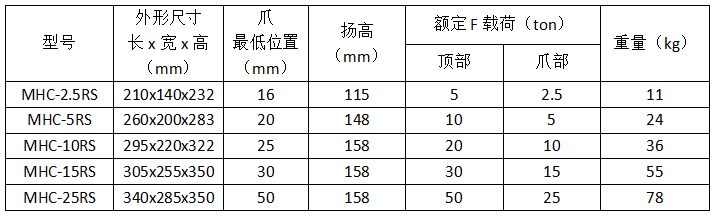 1、本系列產品目前共有五種規(guī)格:MHC-2.5RS、MHC-5RS、MHC-10RS、MHC-15RS、MHC-25RS。廣泛適用于機械設備、橋梁建筑、鐵路軌道等方面的安裝和維修;交通運輸的重物裝卸;汽車拖拉機修理等方面。
